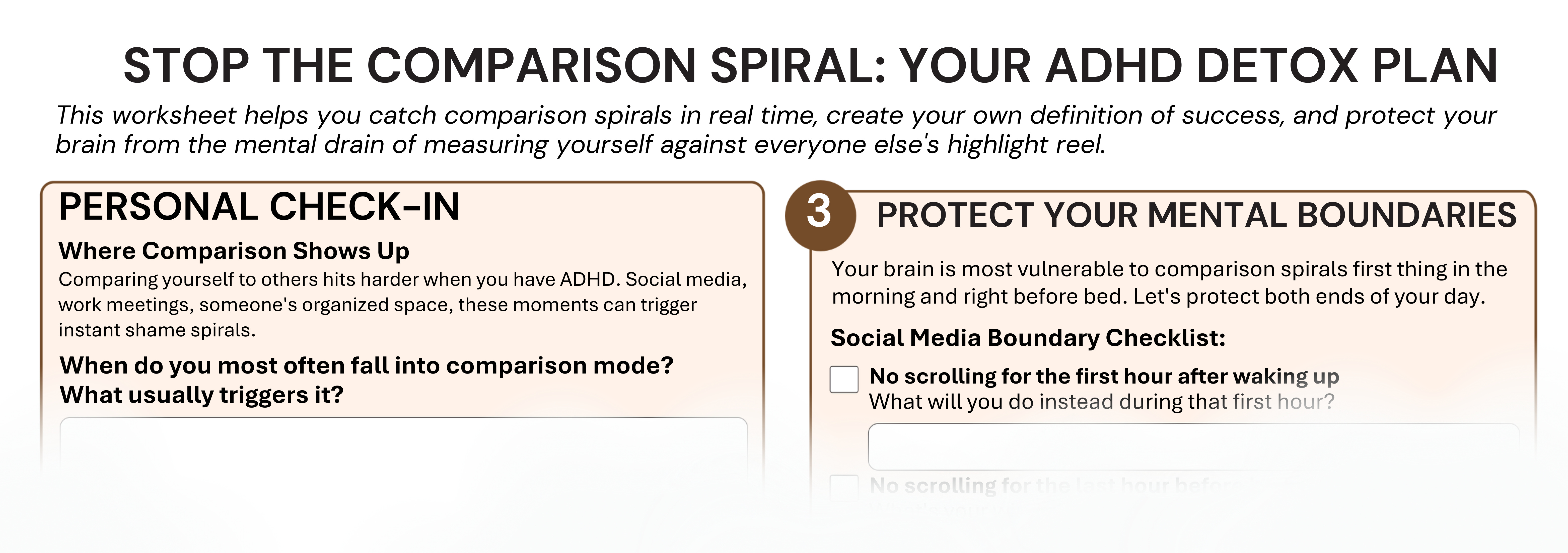 You’ll get a comparison trigger log to track what sets off your shame spirals and how to fact-check them in the moment, and a personal metrics builder to define what success actually means for you (not Instagram). Plus a social media boundary checklist and a 90-day comparison-free zone template with built-in accountability.
