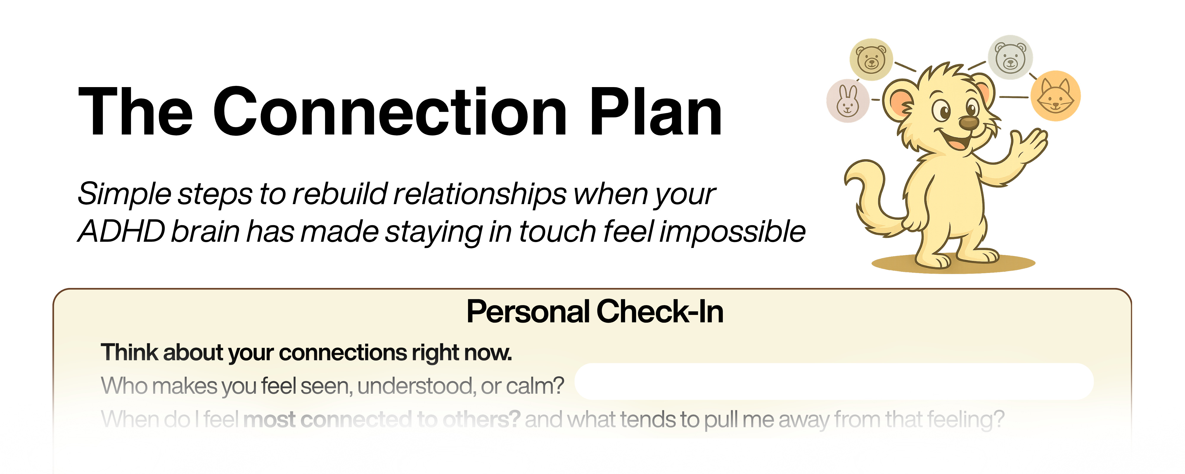 Use it to identify one or two people you want to reconnect with, choose a single strategy to try this week, and set one specific, tiny action step (like “text Susan on Wednesday morning” or “research local book clubs during lunch break Tuesday”). Small, concrete steps are how change actually happens with ADHD. This worksheet helps you bridge the gap between intention and action.