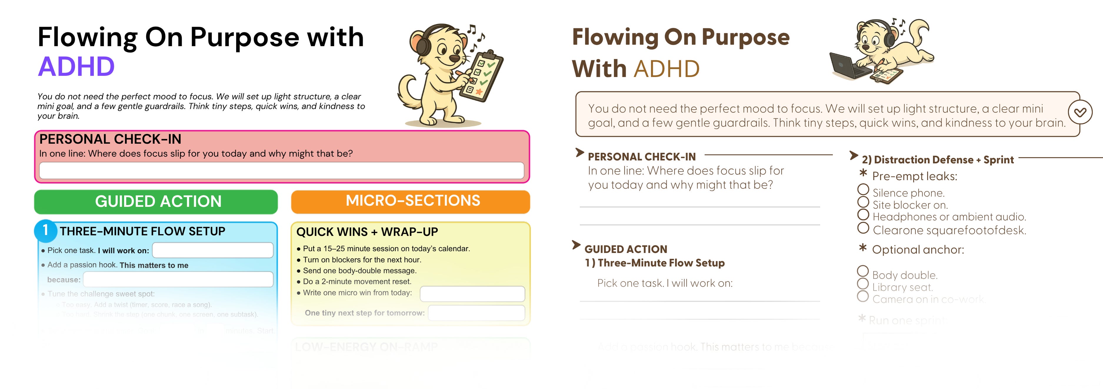 Time to turn these ideas into action. We have distilled the key flow-hacking tools from this newsletter into a handy one-page Flowing On Purpose worksheet, designed with the ADHD brain in mind. This time we made two versions, so grab the one that best matches your working style.