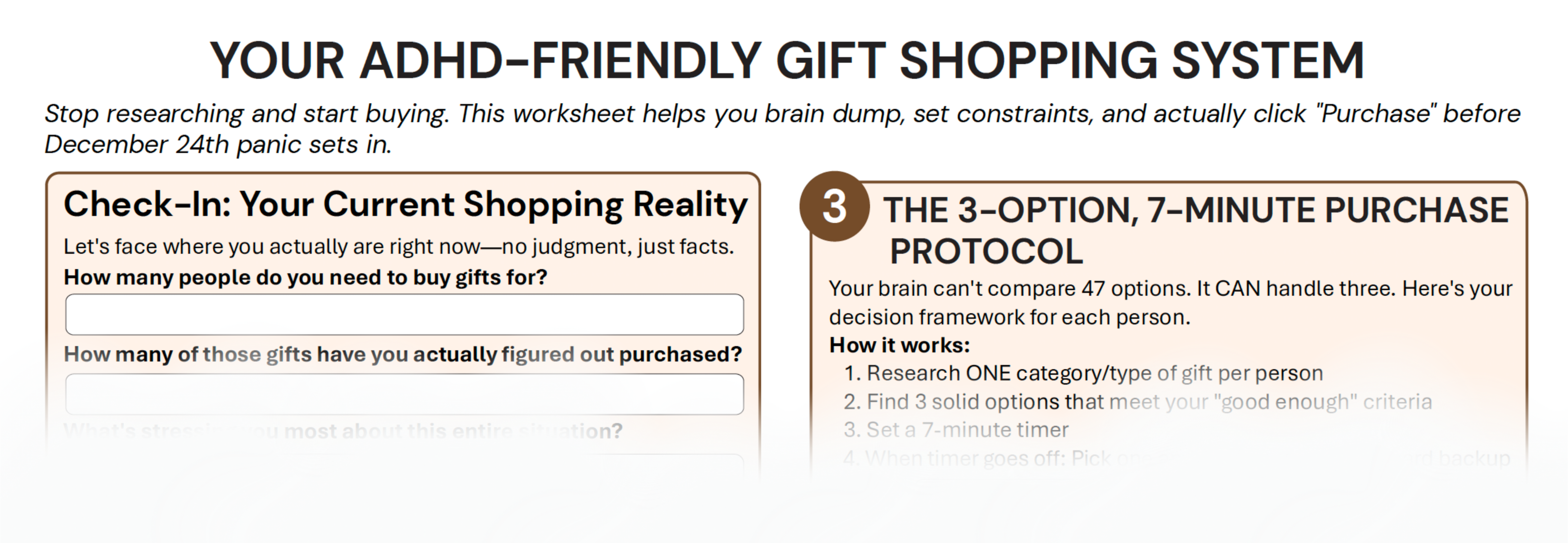 This week’s worksheet gives you a gift brain dump template with hard limits per person, a “good enough” threshold definer to fill out before you start shopping, a 7-minute decision timer protocol with exact steps, and a gift list tracker with purchase deadlines that keeps you accountable to actual buying.