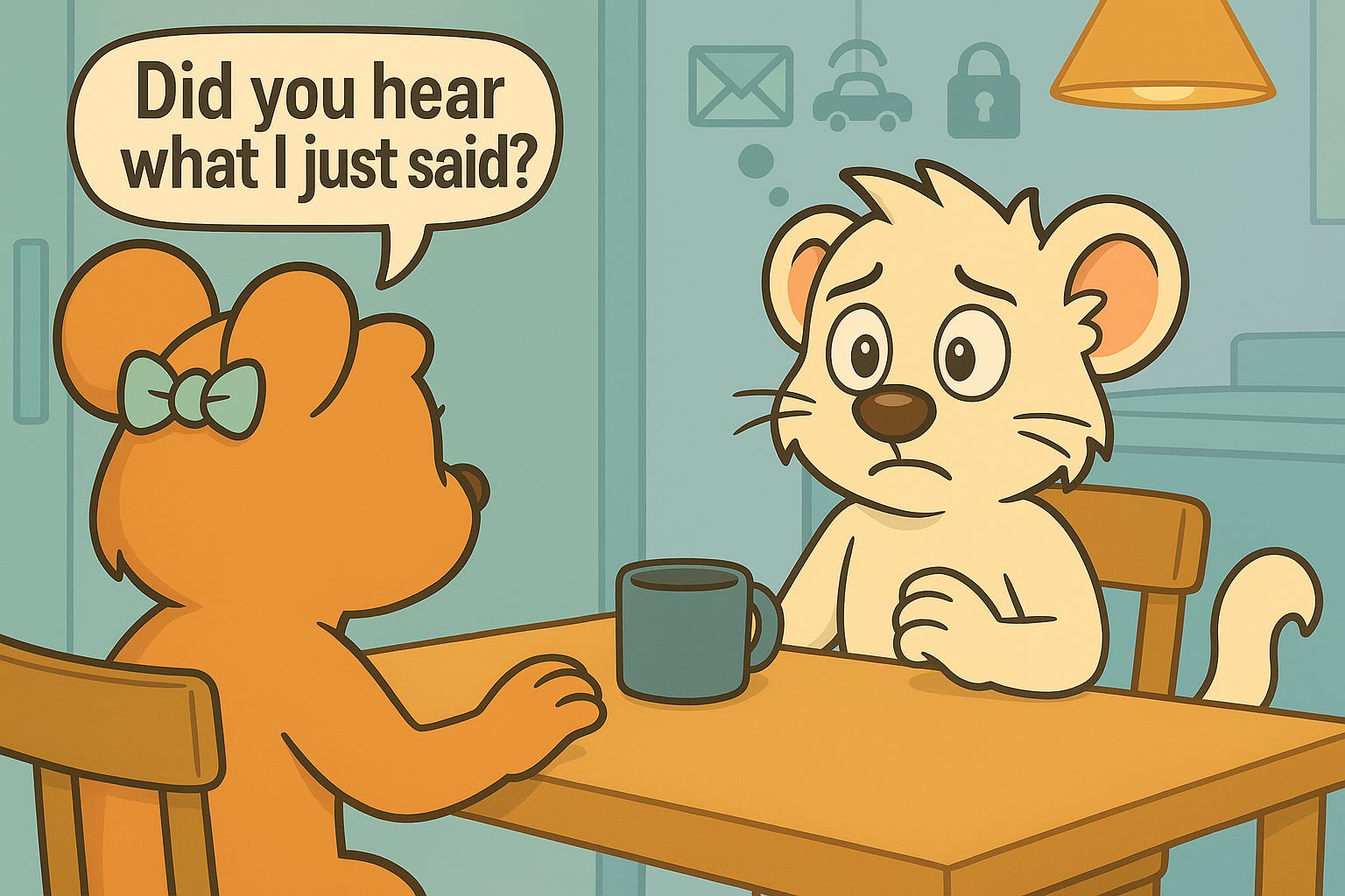 You’re sitting at the kitchen table. Your partner is talking. You’re looking right at them. You can see their mouth moving. You’re nodding. But around sentence three, your brain drifts to that email you forgot to send, the weird sound the car made this morning, whether you locked the front door. By the time you tune back in, they’ve stopped talking and they’re staring at you. “Did you hear what I said?” And you panic. You scramble to grab the last few words still echoing in your head and repeat them back, hoping it sounds like you were actually listening. “Yeah, you said something about Tuesday...” But you have no idea what about Tuesday. You caught the word but missed everything around it.