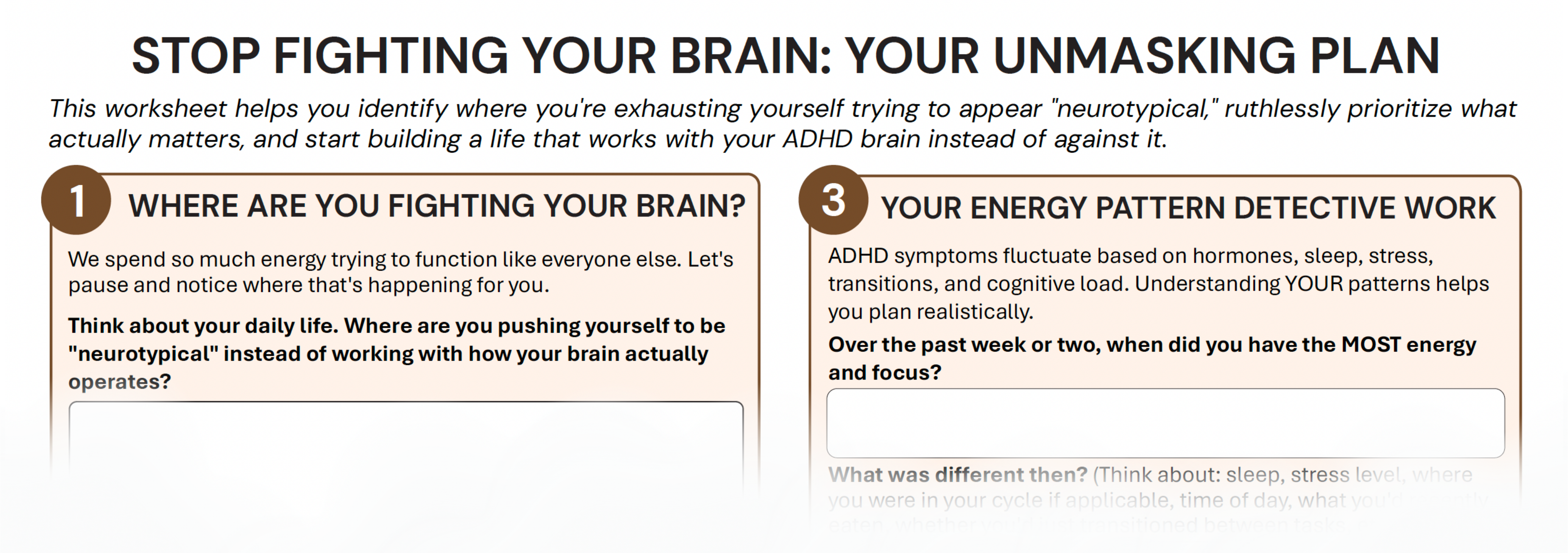 This week’s Apply It worksheet helps you identify where you’re exhausting yourself trying to appear “neurotypical,” ruthlessly prioritize what actually matters, and start building a life that works with your ADHD. Five questions designed to help you stop fighting and start adapting.