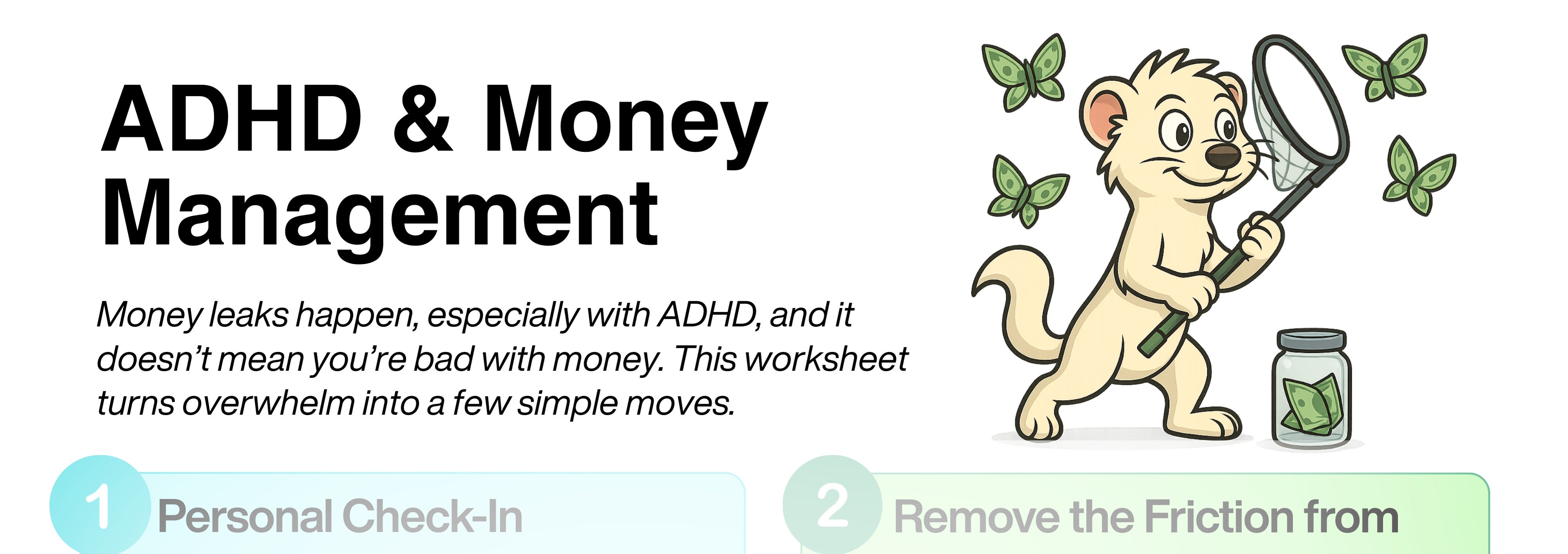 This week's worksheet is all about turning money chaos into manageable systems. It walks you through identifying your current financial feelings, setting up automatic savings that happens without you thinking about it, and budgeting for ADHD mistakes so they don't derail everything. You'll automate bills to remove decision fatigue, reward yourself for taking action, and pick one small financial win to tackle this week. It's not about becoming a budgeting expert, just about making basic money management feel less impossible.