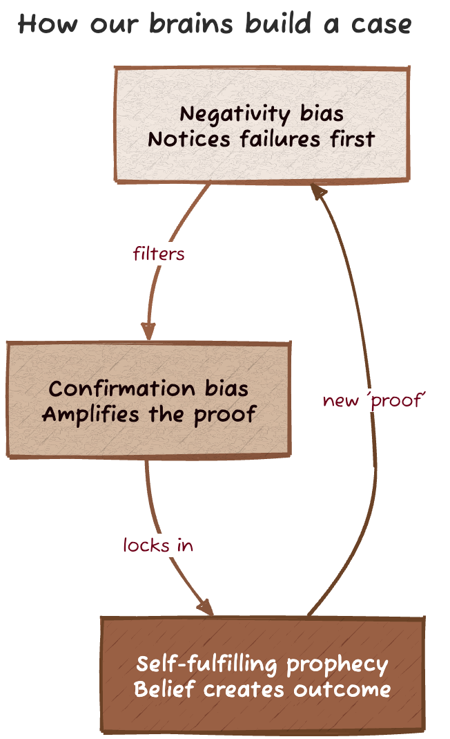 Once that belief is locked in, our brains amplify anything that confirms it and filter out anything that contradicts it. You could handle four things perfectly and your brain will file the one you missed. Years of failure experiences and negative feedback build deep-grooved negative beliefs that run on autopilot, the same voice that used to come from a teacher or a parent now comes from inside your own head. The investigation doesn’t need external input anymore.