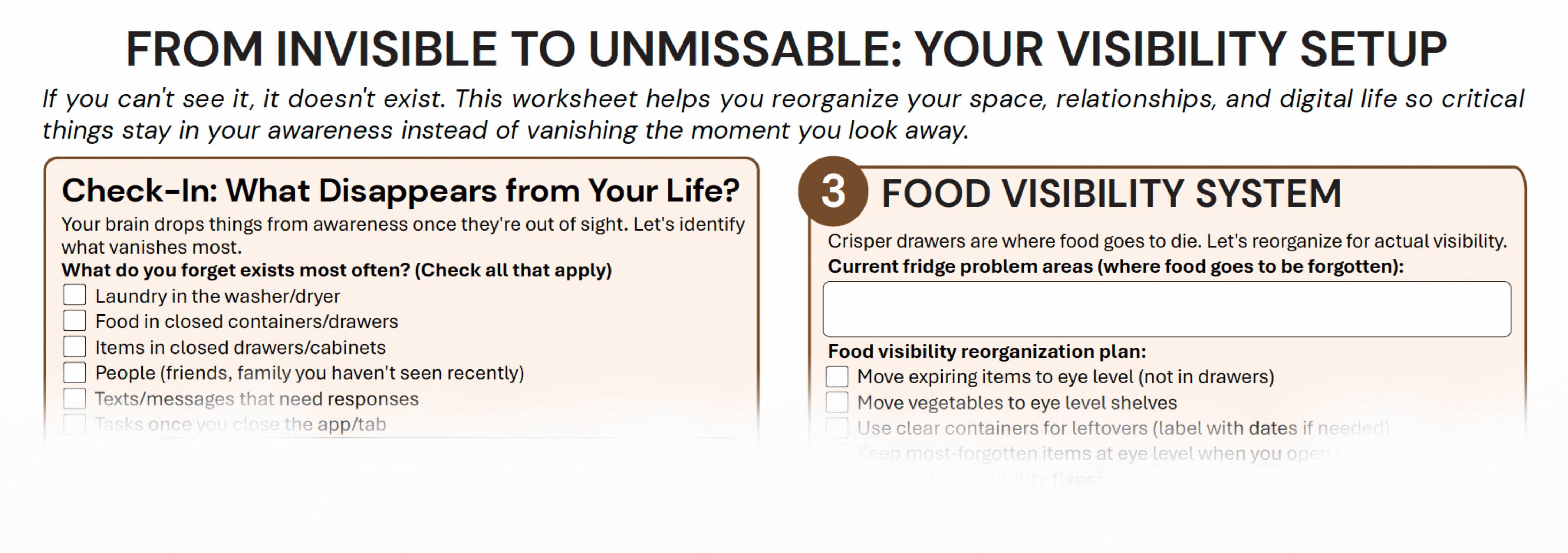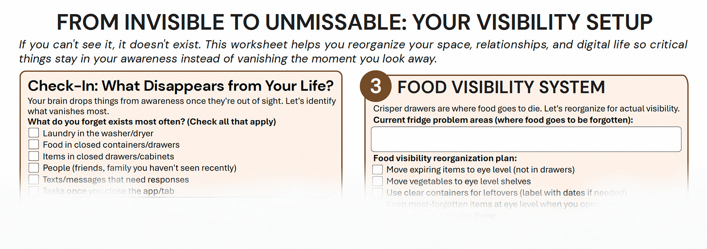 This week’s worksheet includes a room-by-room visibility audit, an exact placement protocol builder for daily items, a weekly existence check calendar for relationships, and a digital setup for texts and tasks.