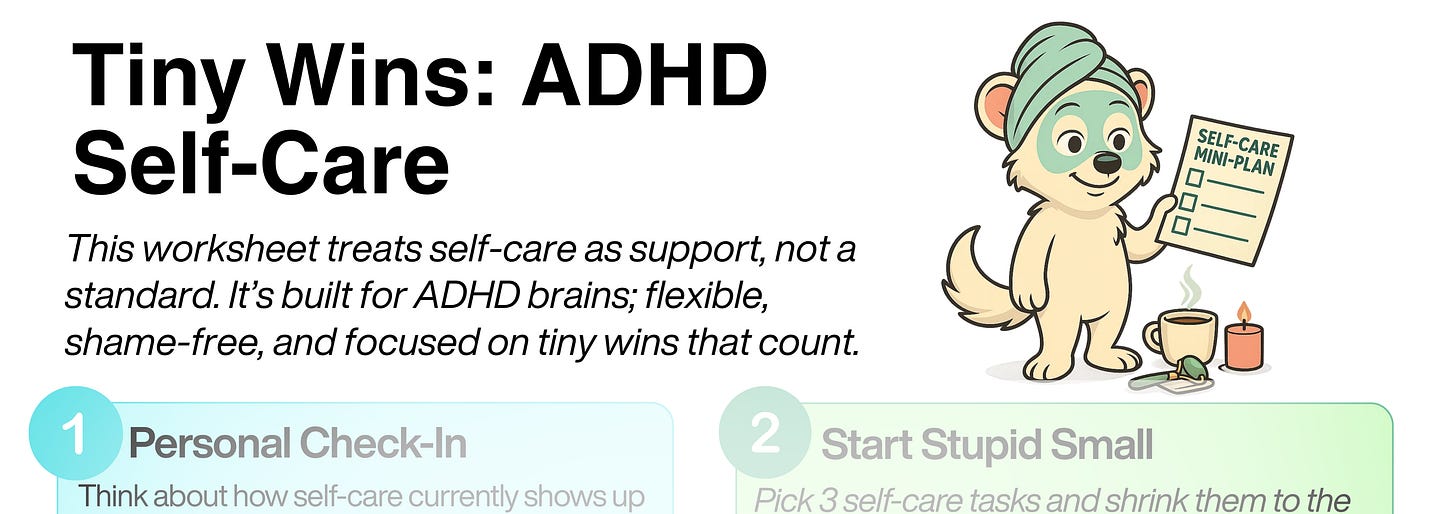 This week's worksheet is all about turning self-care from an overwhelming concept into actual doable actions. It walks you through identifying what's blocking you, breaking down tasks into ridiculously small steps, and figuring out what actually recharges your specific ADHD brain. You'll pair boring necessities with things you enjoy, create your own 'good enough' standards, and pick one or two tiny wins to start with. It's not about becoming a wellness guru, just about making basic self-care feel less impossible.