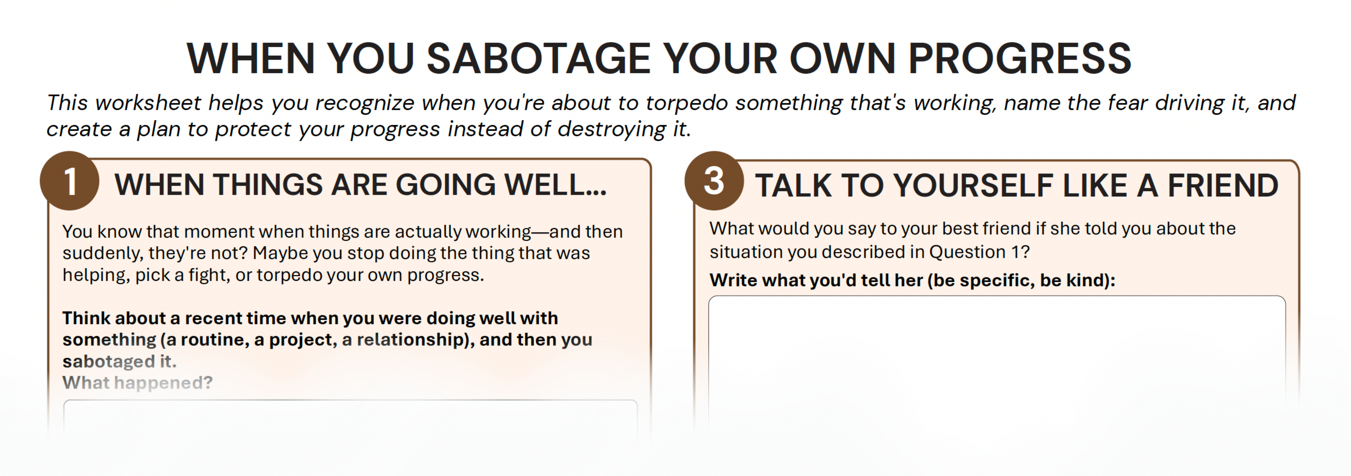 This worksheet helps you catch yourself before you sabotage your own progress. It walks you through naming the specific fear driving it (not just “I’m scared”), then creates a concrete plan to protect what’s working instead of destroying it.