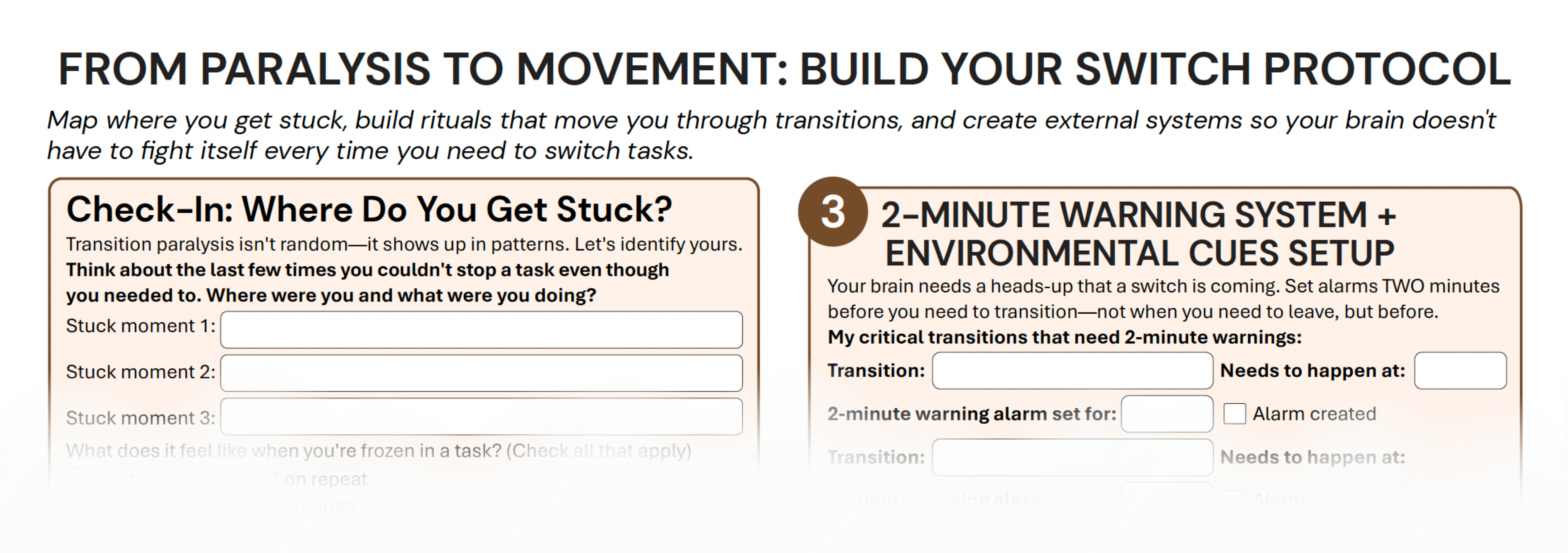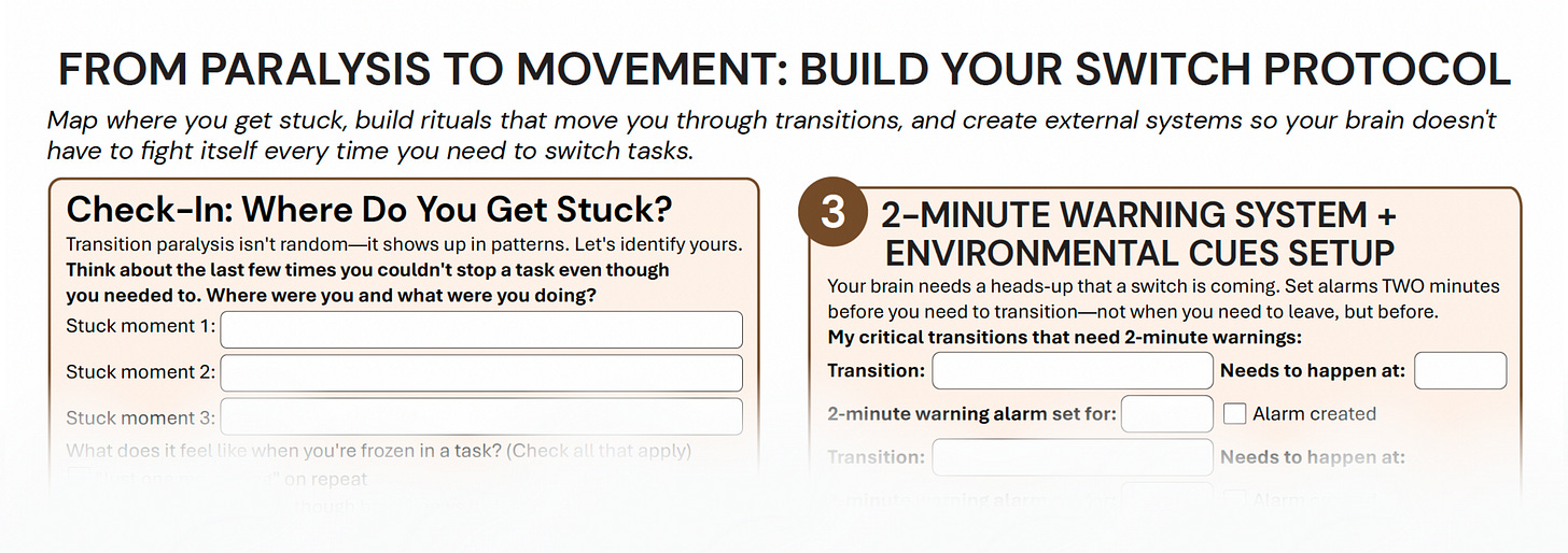 This week’s worksheet gives you a transition ritual builder for your five most common daily switches, a 2-minute warning system setup guide with specific alarm placement, environmental cue maps for your home and workspace, and a body-based transition menu you can reference when you’re frozen. It turns these strategies into external systems so your brain doesn’t have to generate them from scratch every time.