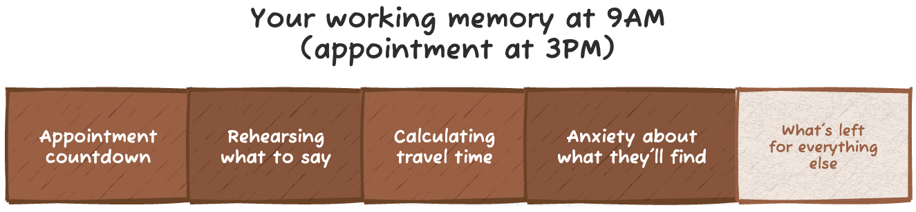 Your working memory is already full. Prospective memory, the ability to remember to do something in the future, is impaired in adults with ADHD. When you have an upcoming appointment, your brain dedicates working memory resources to holding onto that information. It’s running a background process that consumes the exact cognitive bandwidth you’d need to start something else. The appointment hasn’t happened yet, but it’s already using your brain’s limited memory.