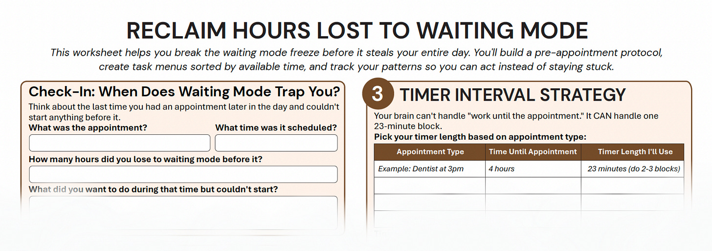 We’ve put together a worksheet this week called Reclaim Hours Lost to Waiting Mode that helps you build a pre-appointment protocol, create task menus sorted by how much time you have, and track your waiting mode patterns. You’ll find it at the end of this newsletter (PDF and digital versions).