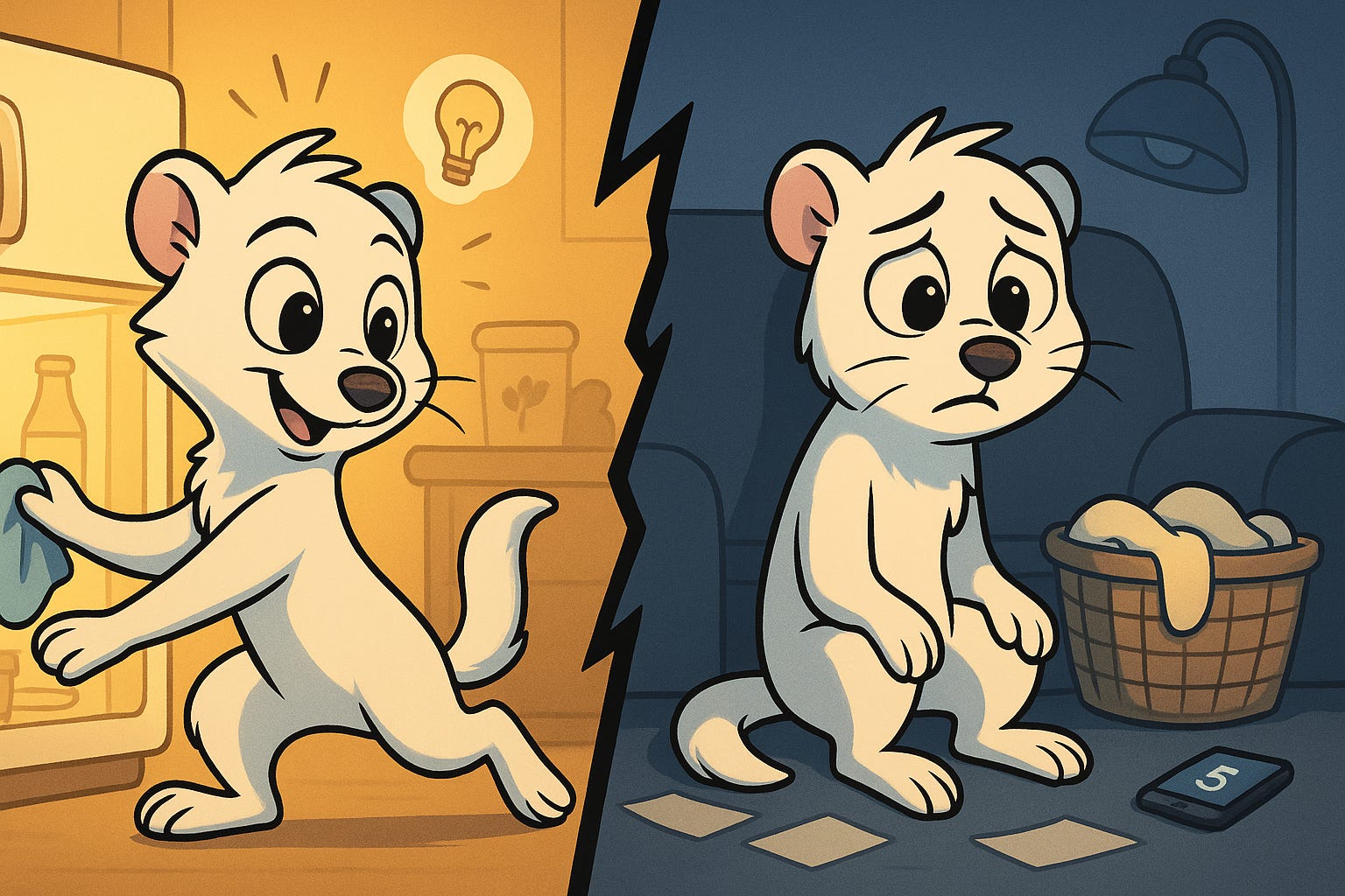 Some days, even starting feels like too much. The full to-do list is just noise. What helps is shrinking it down: like, really down. Not “clean the kitchen,” but “put dishes in sink.” Then maybe “wipe counter.” That’s the level. Writing it out, even on a scrap of paper, clears just enough space in the brain to do one thing. External stuff helps too - sticky notes, a timer, texting your best friend (or the ADHD Weasel Chat) for accountability - not in a pressure-y way, just enough to keep things from floating off into the void.